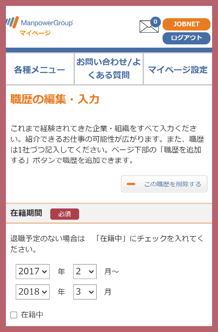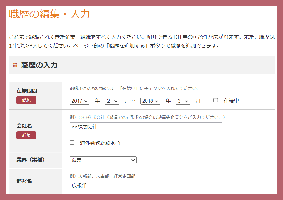 職歴の編集・入力ページとは