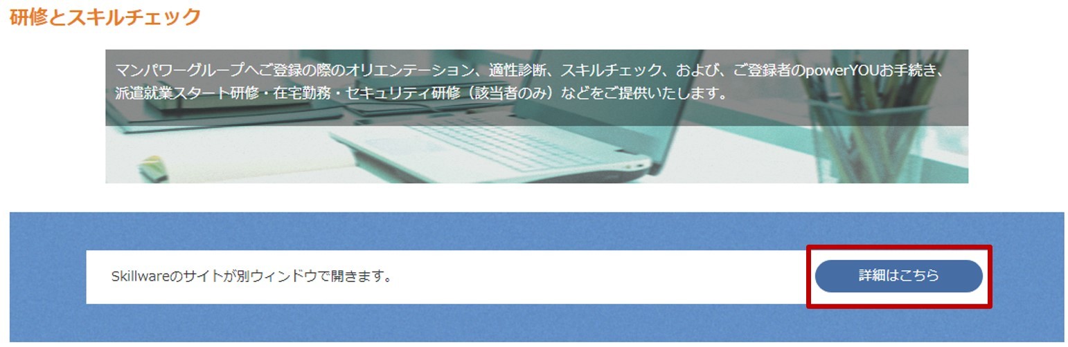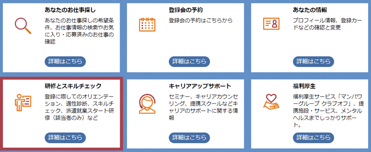 マイページにログイン後、「研修とスキルチェック」からお進みください。
