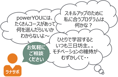 専任のラーナビリティサポーター(通称:ラナサポ)が、数あるプログラムのなかから、人気の高い、無料のオンライントレーニング(powerYOU)を中心にマンパワーグループのオリジナル研修プログラムを提供します。