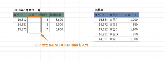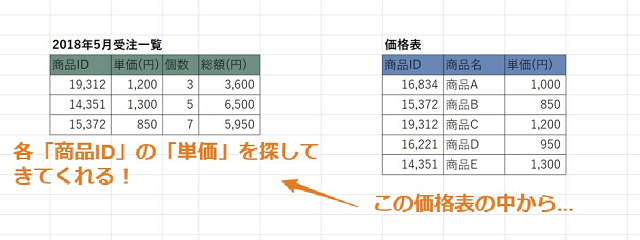 左側の表「2018年5月受注一覧」に2018年5月の受注額を集計したい際に、「商品ID」だけ入力すれば、右側の表「価格表」から各IDの商品の「単価」を探してきてくれるのです。