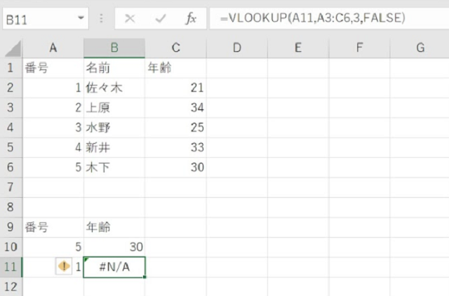= VLOOKUP(A11,A3:C6,3,FALSE)