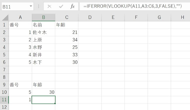 = IFERROR(VLOOKUP(A11,A3:C6,3,FALSE),"")